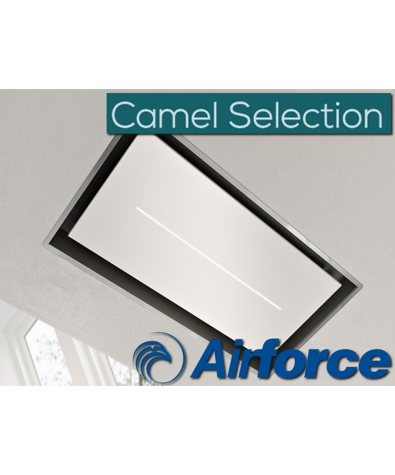 Cappa a soffitto da 100 cm, finitura acciaio inox con vetro nero o bianco, dimensioni 100x50 cm, telecomando a 6 velocità (5+1 intensiva), aspirazione perimetrale, filtri grasso lavabili, portata IEC 740 m3/h, livello sonoro 45/65/70 dB(A), illuminazione 7,8 W strip led 4000 K 190 lux, dimensioni uscita aria 222x89 mm, peso 21 kg, classe energetica A+, foratura 977x477 mm, installabile in controsoffitti di soli 19 cm, uscita aria orientabile, facile installazione.