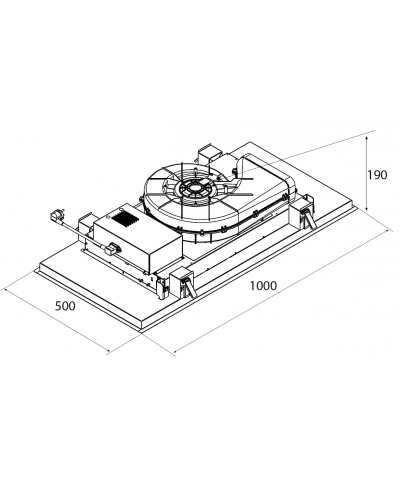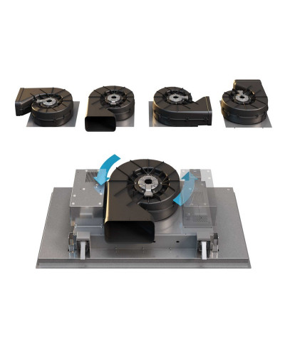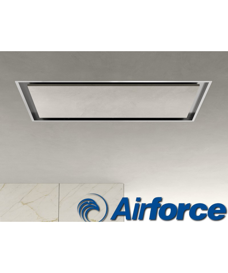 Cappa a soffitto, 100x50 cm, acciaio inox, pannello verniciabile, installabile in controsoffitti di soli 19 cm, aspirazione perimetrale, uscita aria orientabile, telecomando a 6 velocita (5+1 intensiva), portata IEC 740 m3/h, livello sonoro 45/65/70 dB(A), foratura 977x477 mm, dimensione uscita aria 222x89 mm, peso 17 kg, classe energetica A++, facile installazione, filtri grasso lavabili.