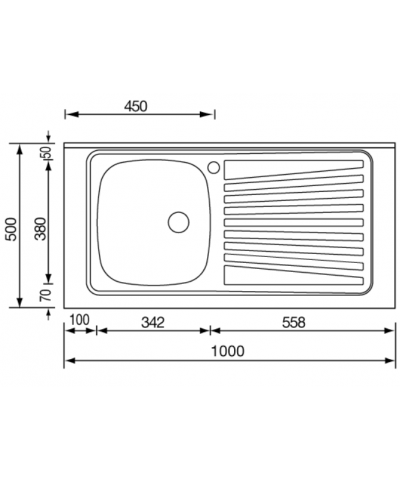 Lavello in acciaio inox AISI 304-18/10, appoggio, monostampo, 100x50 cm 1V, prelucidato, base 60 cm, profondità vasca 15 cm, piletta standard manuale da 2", versione non reversibile.