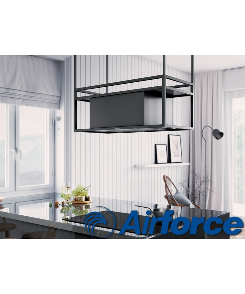 Cappa ad isola nero antracite, 120x40 cm, solo filtrante, mensole laterali in vetro fumè, piano di appoggio superiore, fissaggio tramite barre, telecomando a 4 velocità (3+1 intensiva), diametro uscita aria 150 mm, filtri grasso lavabili, portata IEC 645 m3/h, rumorosità 47/59/63 dB(A), illuminazione 2x9 W strip led, temperatura di colore 4000 K, intensità 383 Lux, classe energetica B, distanza minima dal piano cottura 50 cm se a induzione e 65 cm se a gas, filtri odori regular inclusi.