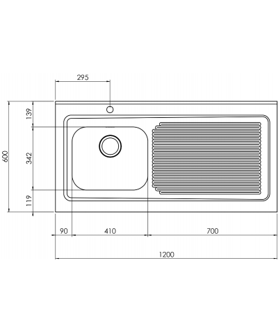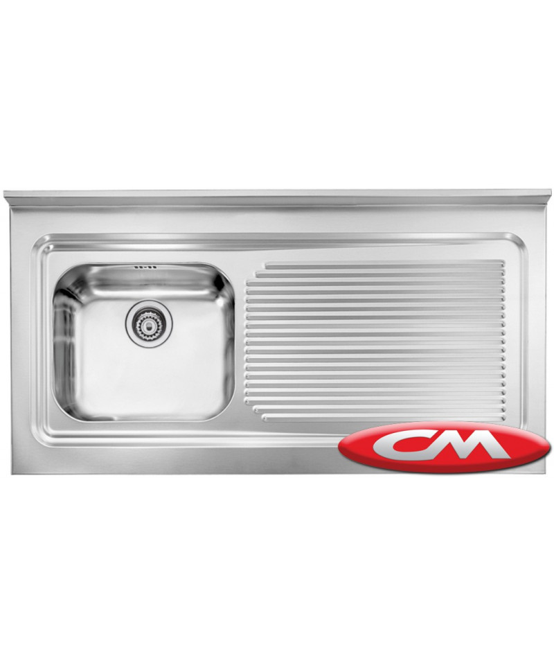 Lavello in acciaio inox AISI 304-18/10, vasca saldata, 120x60 1V, appoggio, satinato, base da 60 cm, profondità vasca 20 cm, piletta standard manuale da 3", versione non reversibile.