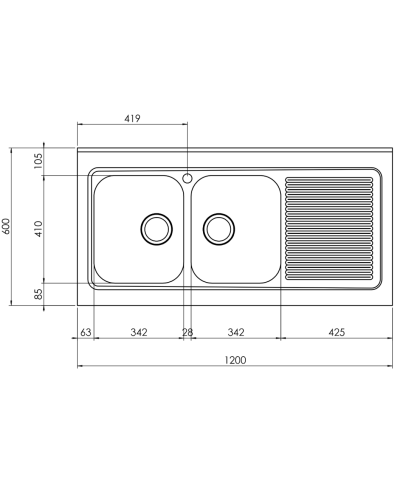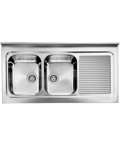 Lavello in acciaio inox AISI 304-18/10, vasca saldata, 120x60 cm 2V, appoggio, satinato, base da 80 cm, profondità vasche 19 cm, piletta standard manuale da 3", versione non reversibile.