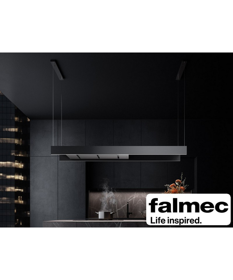 Cappa ad isola da 180 cm, filtrante, finitura in acciaio verniciato nero satinato opaco, vetro fumé, corpo ultra sottile, profili in alluminio anodizzato satinato nero o bronzo, aspirazione perimetrale, tecnologia aspirante ultra compatta Multi-Air, motore brushless da 500 m3/h, pulsantiera elettronica 4 velocità, filtro antiodore Carbon.Zeo Microtech rigenerabile, filtro antigrasso metallico asportabile e lavabile, illuminazione a strip led 3000 K integrata nei profili, luce ambientale, telecomando incluso, Dialogue system, livelli sonori min-max 43-62 dB(A), 220-240 V 50-60 Hz, peso 40 kg, distanza minima dal piano cottura 65 cm se a gas e 52 cm se a induzione.