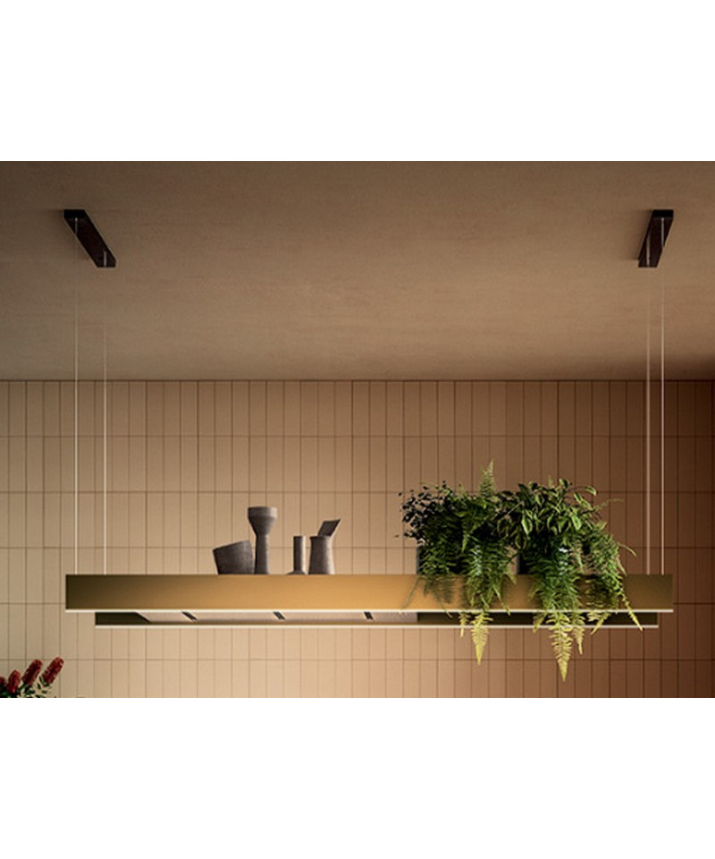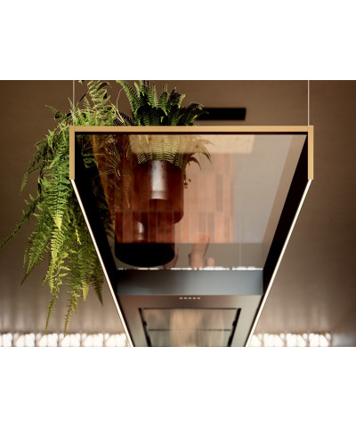Cappa ad isola da 180 cm, filtrante, finitura in acciaio verniciato nero satinato opaco, vetro fumé, corpo ultra sottile, profili in alluminio anodizzato satinato nero o bronzo, aspirazione perimetrale, tecnologia aspirante ultra compatta Multi-Air, motore brushless da 500 m3/h, pulsantiera elettronica 4 velocità, filtro antiodore Carbon.Zeo Microtech rigenerabile, filtro antigrasso metallico asportabile e lavabile, illuminazione a strip led 3000 K integrata nei profili, luce ambientale, telecomando incluso, Dialogue system, livelli sonori min-max 43-62 dB(A), 220-240 V 50-60 Hz, peso 40 kg, distanza minima dal piano cottura 65 cm se a gas e 52 cm se a induzione.