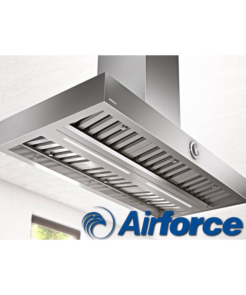 Cappa ad isola in acciaio inox o nero antracite da 180 cm, sistema No-Drop con filtri baffle in acciaio inox, comando rotativo elettronico con modulazione di potenza, diametro uscita aria 150 mm, filtri grasso baffle in acciaio inox + vaschetta di raccolta estraibile e lavabile, portata IEC 800 m3/h, rumorosità 44/62/70 dB(A), illuminazione 2x4,8 W strip led, temperatura di colore 4000 K, intensità 154 Lux, classe energetica A++, distanza minima dal piano cottura 50 cm se a induzione e 65 cm se a gas.