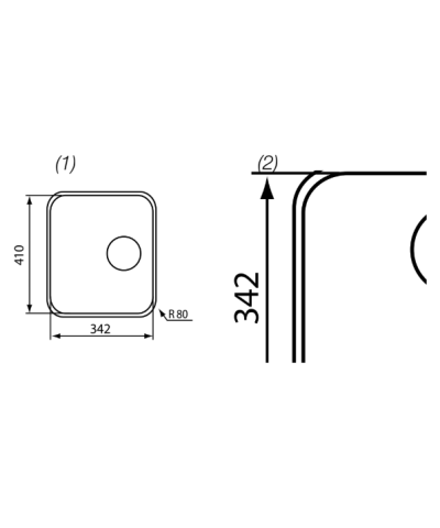 Lavello in acciaio inox AISI 304-18/10, piletta da 3", satinato, sottotop, 34,2x41 cm R80, base (1) da 50 cm, base (2) 60 cm, profondità vasca 19 cm, foro sottotop vedi manuale di installazione, piletta standard manuale.