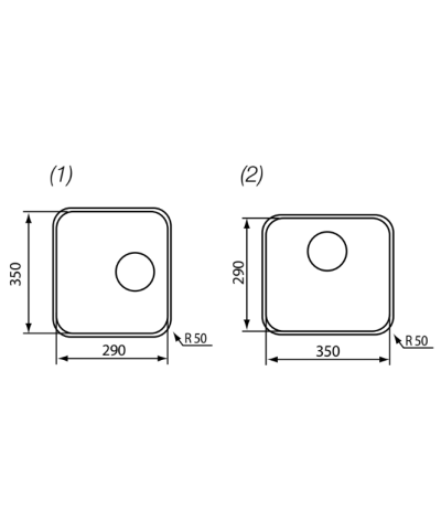 Lavello in acciaio inox AISI 304-18/10, piletta da 3", antigraffio, sottotop, 35x29 cm R50, base (1) da 45 cm, base (2) 50 cm, profondità vasca 17 cm, foro sottotop vedi manuale di installazione, piletta standard manuale.