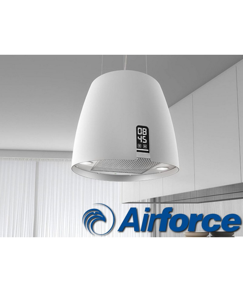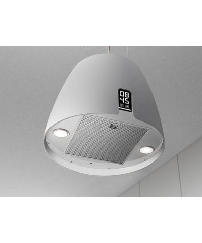 Cappa ad isola in polimero verniciato bianco/nero, solo filtrante, dimensioni 47,5 cm di diametro, illuminazione a Led 2x2,1W, 3500 k, 420 lux, display touch a 4 velocità (3+1 intensiva), rumorosità 49/64/68 dB(A), portata IEC 610 m3/h, dimensioni uscita aria 150x100 mm, distanza minima dal piano cottura 50 cm se a induzione e 65 cm se a gas, filtri odori regular inclusi, classe energetica C, filtri grasso lavabili.
