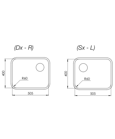 Lavello in acciaio inox AISI 304-18/10, piletta da 3", satinato, sottotop, 50x40 cm R60, base 80 cm, profondità vasca 20 cm, foro sottotop vedi manuale di installazione, piletta standard manuale, versione non reversibile.