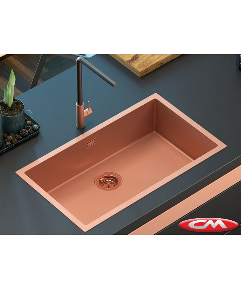 Lavello Iride in acciaio matt con trattamento PVD, 3" - 77x45x19, slim/sottotop/filotop, base incasso mm 800/base sottotop mm 900/base filotop mm 800, profondità vasca mm 190, foro incasso mm 750x430, foro sottotop mm 720x400 r10, foro filotop (manuale installazione), piletta standard manuale.