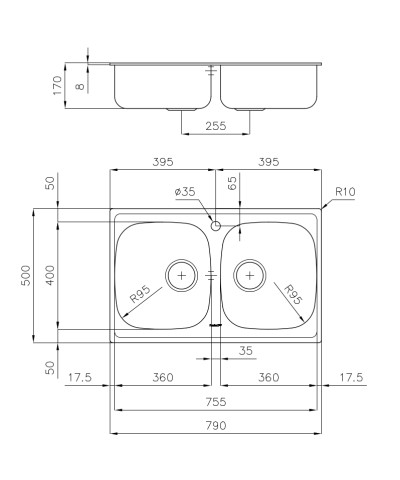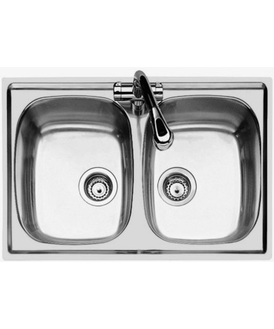 Lavello prelucidato per base 80 cm, acciaio AISI 304, dimensioni 79x50 cm, profondità vasche 17 cm, dimensioni vasche 36x40 cm, dimensioni incasso 77x48 cm, piletta 3,5".