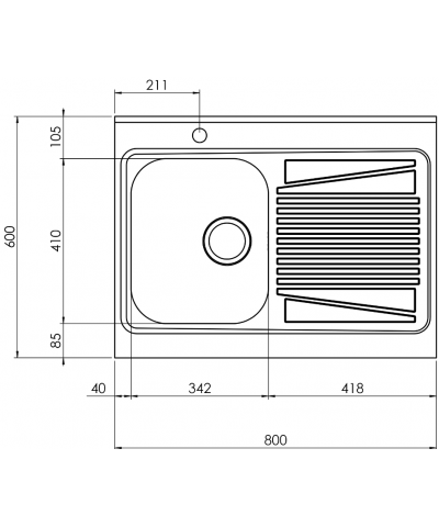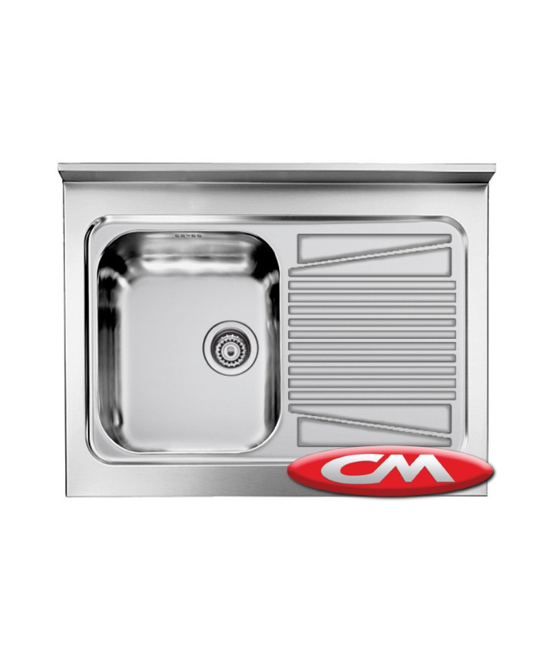 Lavello in acciaio inox AISI 304-18/10, vasca saldata, 80x60 1V, appoggio, satinato, base da 45 cm, profondità vasca 19 cm, piletta standard manuale da 3", versione non reversibile.