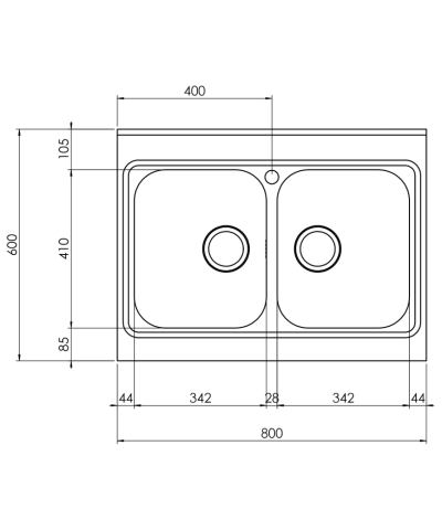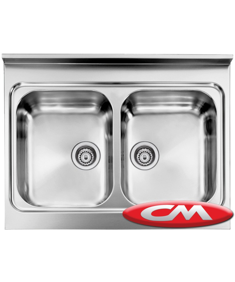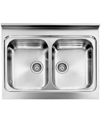 Lavello in acciaio inox AISI 304-18/10, vasca saldata, 80x60 cm 2V, appoggio, satinato, base da 80 cm, profondità vasche 19 cm, piletta standard manuale da 3".