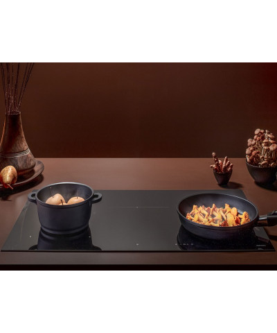 Piano a induzione da 90 cm, 5 zone di cottura (2 x 190x210 mm, 1x265 mm di diametro, 2x175 mm di diametro), LED rossi, vetroceramica nero lucido, tecnologia Flex Surface, 9 livelli di cottura + boost, comando touch con display LED, Dialogue System, gestione dei livelli di potenza da 2,8 a 10,4 W, voltaggio/frequenza 220-240 V 50-60 Hz, peso netto 13 kg. Funzioni di cottura: indicatore di calore residuo, timer di fine cottura per ciascuna zona, funzione Recall, funzione Keep Warm 44°, rilevamento automatico della pentola, funzione Pausa, funzione Chef, funzione bridge.