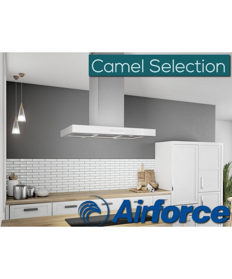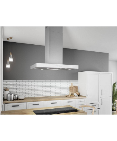 Cappa ad isola in acciaio inox e vetro nero o bianco, dimensioni 90x60 cm, illuminazione a Led 4x2,1W, temperatura di colore 3500 K, intensità 589 lux, comando touch a 4 velocità (3+1 intensiva) con avviso saturazione filtri grasso e carbone, sensore di calore per il funzionamento automatico, timer, rumorosità 48/62/66 dB(A), portata IEC 610 m3/h, filtri grasso lavabili, classe energetica A, diametro uscita aria 150 mm, distanza minima dal piano cottura 50 cm se a induzione e 65 cm se a gas.