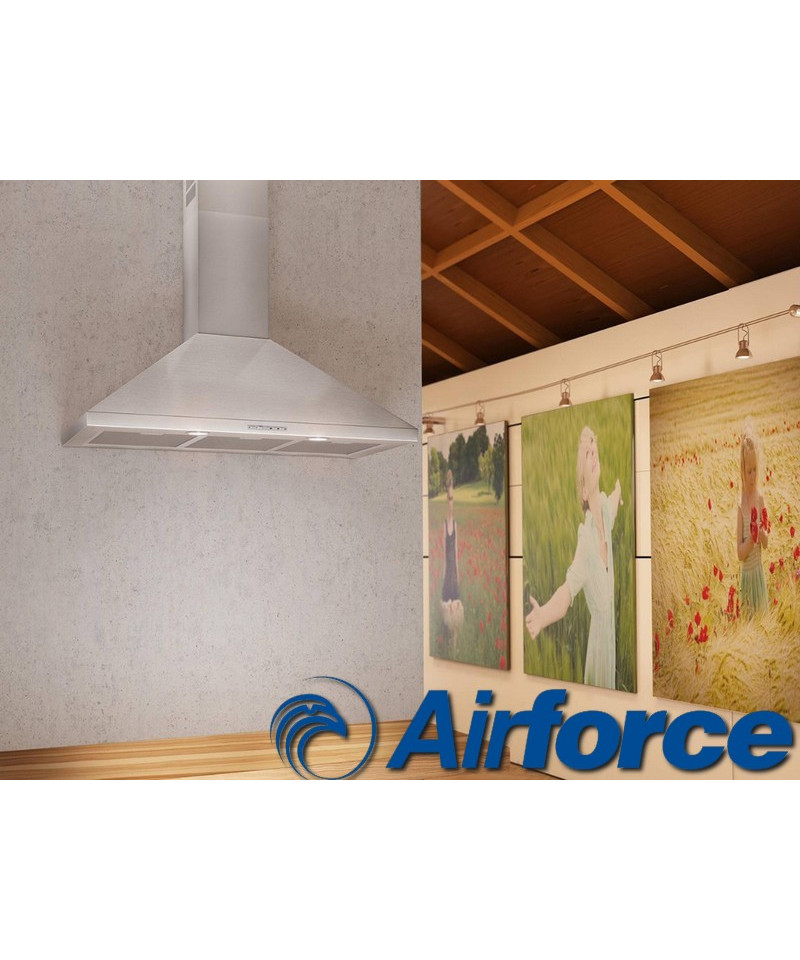 Cappa a parete in acciaio inox, dimensioni 90 cm, illuminazione a Led 2x2,1W, 3500 K, 336 lux, pulsantiera meccanica a 4 velocità, rumorosità 50/71 dB(A), portata IEC 645 m3/h, dimensione uscita aria 150 mm, filtri grasso lavabili, classe energetica B, distanza minima dal piano cottura 50 cm se a induzione e 65 cm se a gas.
