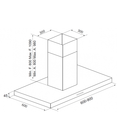 Cappa ad isola da 90 cm, finitura acciaio inox, dimensioni 90x60 cm, portata IEC 620 m3/h, livello sonoro 48/64/68 dB(A), illuminazione 4x2,1 W led, 3500 K, 589 lux, comando touch a 4 velocità (3+1 intensiva), modalità automatica, timer, controllo filtri, dimensioni uscita aria diametro 150 mm, distanza minima dal piano cottura 50 cm se a induzione e 65 cm se a gas, classe energetica A, filtri grasso lavabili.