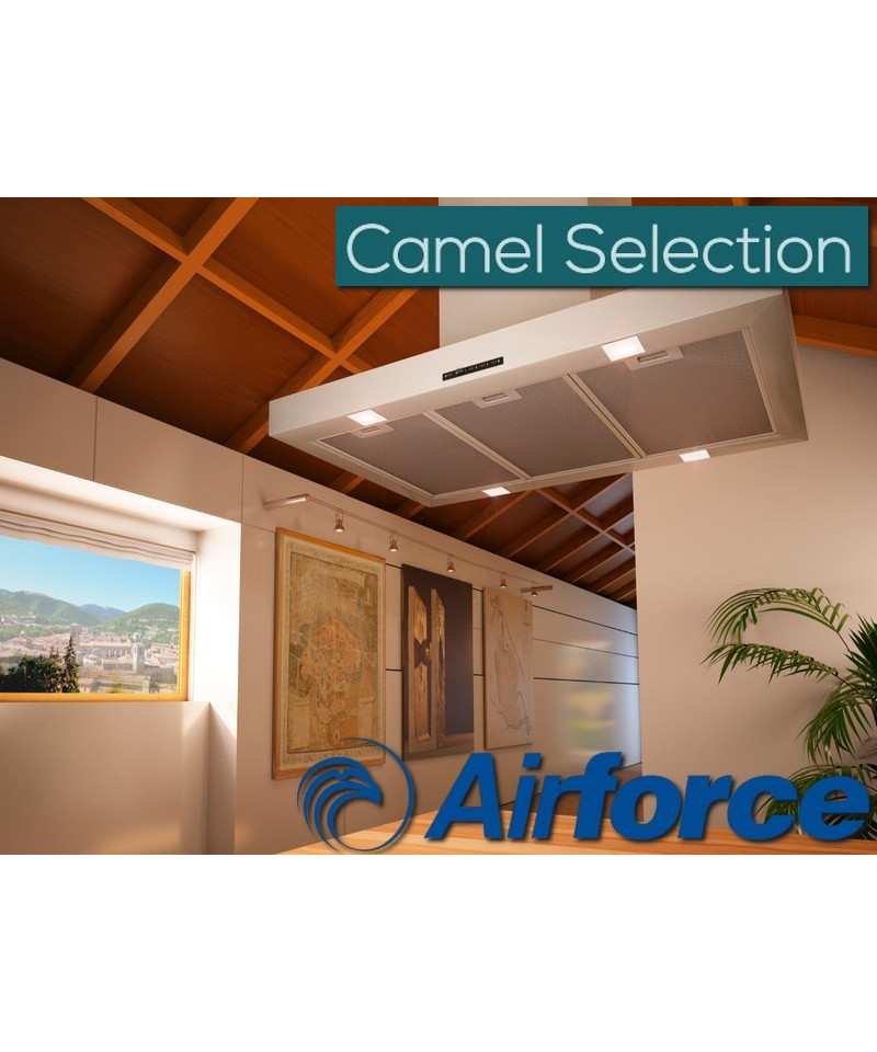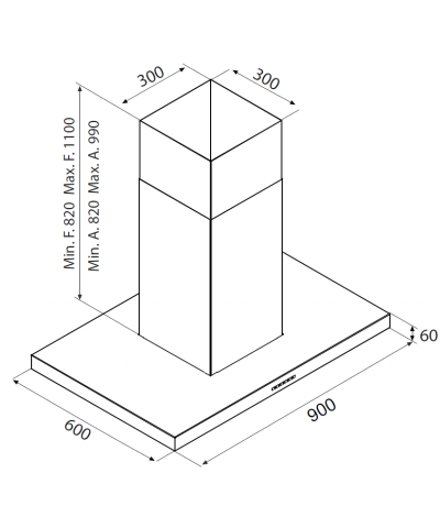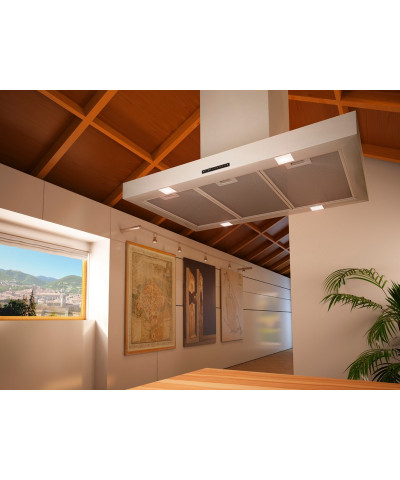 Cappa ad isola, dimensioni 90x60 cm, finitura acciaio inox o nera, portata IEC 625 m3/h, livello sonoro 48/66 dB(A), illuminazione 4x2,1 W led, 4000 K, 236 lux, pulsantiera meccanica a 4 velocità, diametro uscita aria 150 mm, distanza minima dal piano cottura 50 cm se a induzione e 65 cm se a gas, classe energetica A, filtri grasso lavabili.