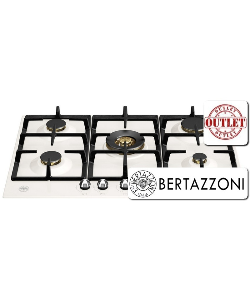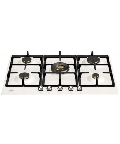 Piano cottura a gas da 75 cm, wok centrale, avorio/inox, serie Heritage. Cinque bruciatori in ottone, wok 4kW centrale, griglie in ghisa, manopole in metallo, isolamento termico manopole, accensione elettronica istantanea, sistema di sicurezza fiamma sicura, bordo semifilo, misura incasso standard, finitura piano in acciaio smaltato avorio/inox.