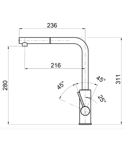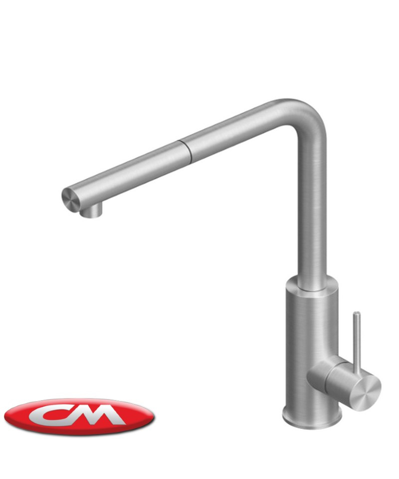 Miscelatore finitura inox con canna girevole e doccia estraibile, diametro ghiera 55 mm.