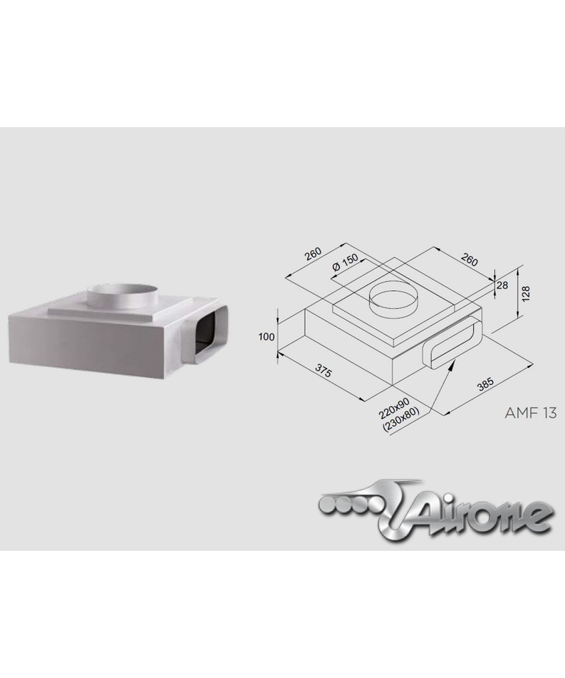 Motore flat AMF13, portata motore IEC 450-855 m3/h, pressione motore velocità massima 760 Pa, livello sonoro 64-80 dBA, potenza 190 W, lunghezza cavo 10 m, diametro raccordo d'ingresso 150 mm, diametro raccordo di uscita 220x290 / 230x80 mm.