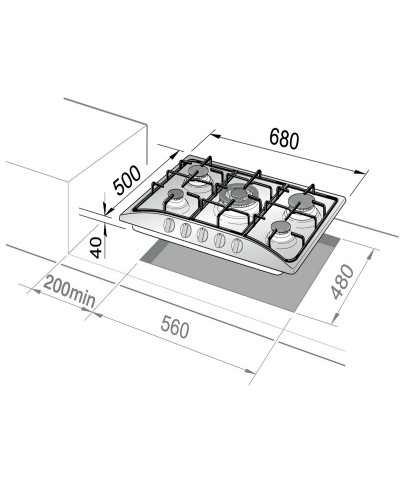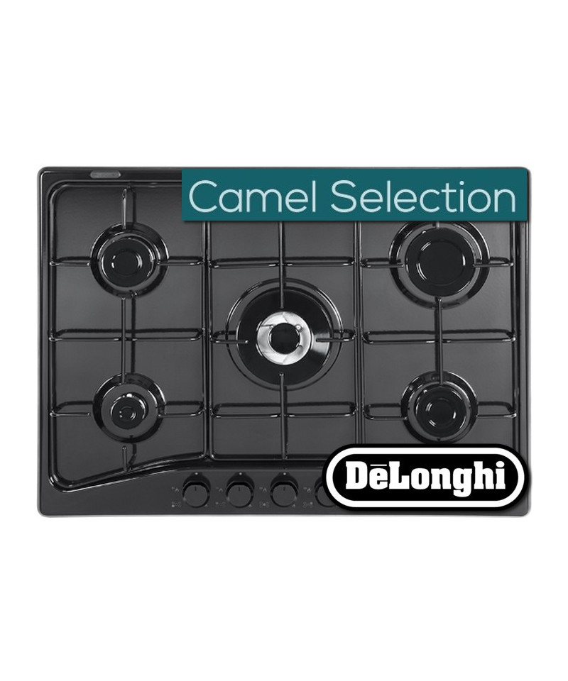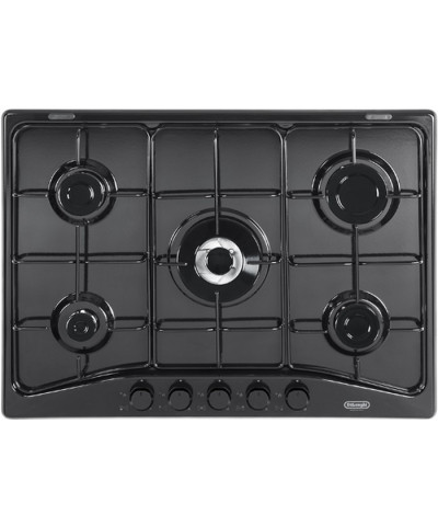 Piano cottura da 70 cm, nero, 5 fuochi a gas di cui un bruciatore doppia corona, griglie smaltate nere, teste bruciatori smaltate nere, vano incasso dei piani da 60 cm.