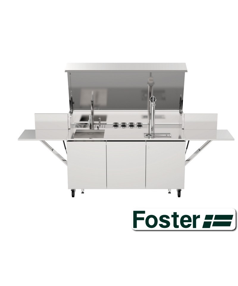 Cucina da esterno erogatore bevande + lavello, linea Finalmente, acciaio inox AISI 316, dimensioni chiuso 1850x780x1190 mm, dimensioni aperto 3270x800x1930 mm, peso 350 kg, certificato per uso esterno (grado di protezione IPX5), coperchio con sistema di blocco antichiusura, 2 mensole laterali apribili, 4 ruote (2 con sistemi di blocco), 4 piedini regolabili per posa a terra. Prodotti integrati Foster: 1011050 vasca Milano saldata 462x400 mm (Aisi 316), 8550000 miscelatore Atomo con bocca estraibile, 8530000 dispenser Round. Erogatore bevande integrato: spillatore bevande montato su colonna abbattibile, capacità di erogazione 50l/h, vaschetta inox saldata per raccolta liquidi dotata di sistema rinfresca bicchieri. Canale attrezzato integrato: portabicchieri e portapiatti, 4 contenitori rotondi di diversa profondità. Dotazioni ante frontali: vano con cassettone raccolta differenziata a 4 scomparti e mensola in acciaio inox, vano con refrigeratore bevande e meccanismo salita/discesa colonna birra, vano con cassettone per posizionamento fusto e cassetto interno. Dotazioni posteriori: quadro elettrico IP65, spina elettrica da parete monofase 230V 32A IP66, attacco acqua calda e fredda, scarico acqua lavello e liquidi vaschetta. Alimentazione elettrica: 220-240V, 50-60 Hz, Imax 32A.