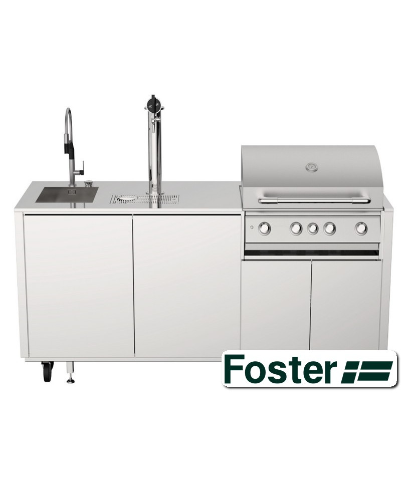 Cucina da esterno lavello + erogatore bevande + barbecue, linea Insieme, acciaio inox AISI 316, dimensioni 1960x850x1520 mm, peso 340 kg, certificato per uso esterno (grado di protezione IPX5), 4 ruote (2 con sistemi di blocco), 4 piedini regolabili per posa a terra. Prodotti integrati Foster: 1241050 vasca Quadra saldata 340x400 mm (Aisi 316), 8425100 miscelatore Milanello con bocca estraibile, 8407115 piletta automatica Space Milano. Barbecue integrato: area di cottura 770x490 mm, coperchio coibentato con termometro analogico, 4 bruciatori (P. termica 4.4 kW), griglia infrarossi (P. termica 4.4 kW), luci interne, collaudo gas GPL, set ugelli metano su richiesta. Erogatore bevande integrato: spillatore bevande montato su colonna fissa, capacità di erogazione 50l/h, vaschetta inox saldata per raccolta liquidi dotata di sistema rinfresca bicchieri. Dotazioni ante frontali: vano con refrigeratore bevande, vano per posizionamento fusto e accesso a quadro elettrico IP65, vano con mensola in acciaio inox. Dotazioni posteriori: spina elettrica da parete monofase 230V 16A IP66, attacco acqua calda e fredda, attacco gas, scarico acqua lavello e liquidi vaschetta. Alimentazione elettrica: 220-240V, 50-60 Hz, Imax 16A.