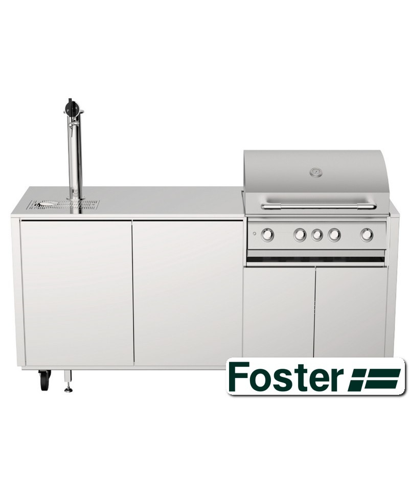 Cucina da esterno erogatore bevande + barbecue, linea Insieme, acciaio inox AISI 316, dimensioni 1960x850x1520 mm, peso 325 kg, certificato per uso esterno (grado di protezione IPX5), 4 ruote (2 con sistemi di blocco), 4 piedini regolabili per posa a terra. Barbecue integrato: area di cottura 770x490 mm, coperchio coibentato con termometro analogico, 4 bruciatori (P. termica 4.4 kW), griglia infrarossi (P. termica 4.4 kW), luci interne, collaudo gas GPL, set ugelli metano su richiesta. Erogatore bevande integrato: spillatore bevande montato su colonna fissa, capacità di erogazione 50l/h, vaschetta inox saldata per raccolta liquidi dotata di sistema rinfresca bicchieri. Dotazioni ante frontali: vano con refrigeratore bevande, vano per posizionamento fusto e accesso a quadro elettrico IP65, vano con mensola in acciaio inox. Dotazioni posteriori: spina elettrica da parete monofase 230V 16A IP66, attacco acqua calda e fredda, attacco gas, scarico liquidi vaschetta. Alimentazione elettrica: 220-240V, 50-60 Hz, Imax 16A.