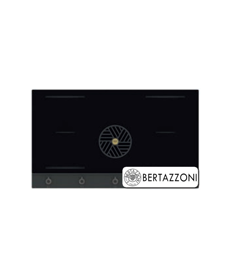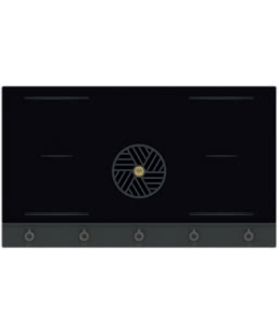 Piano a induzione da 90 cm con cappa integrata centrale e manopole, 4 zone a induzione (210x190 mm 2,1 kW - 3 kW booster), aspirazione centrale, 9 livelli di potenza + booster, interfaccia LED bianchi, sicurezza fuoriuscita liquidi, indicatore di calore residuo, sicurezza bambini, portata massima 640 m3/h, 10 velocità, rumorosità 66 dBA, indicatore di saturazione filtri, limitazione potenza 3,1- 4,5 kW, classe energetica A, dimensioni 90x53 cm.